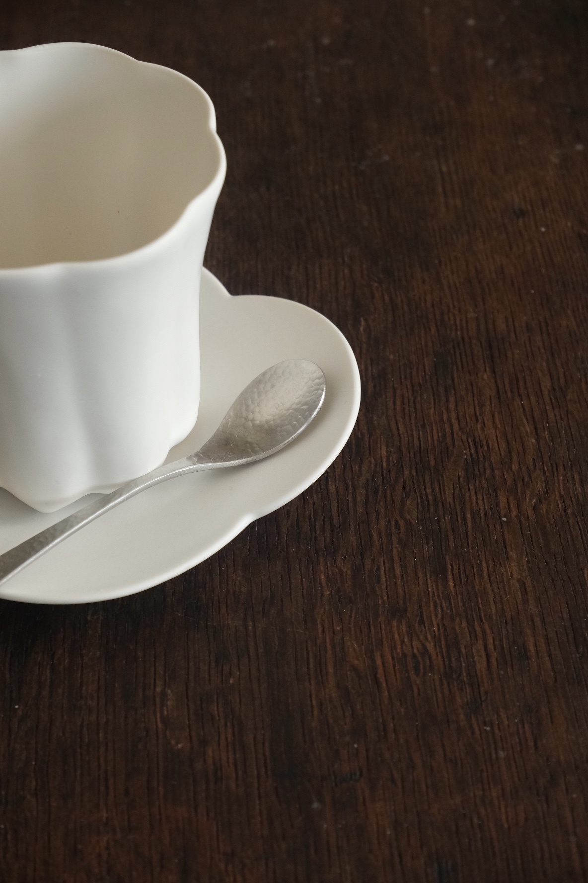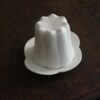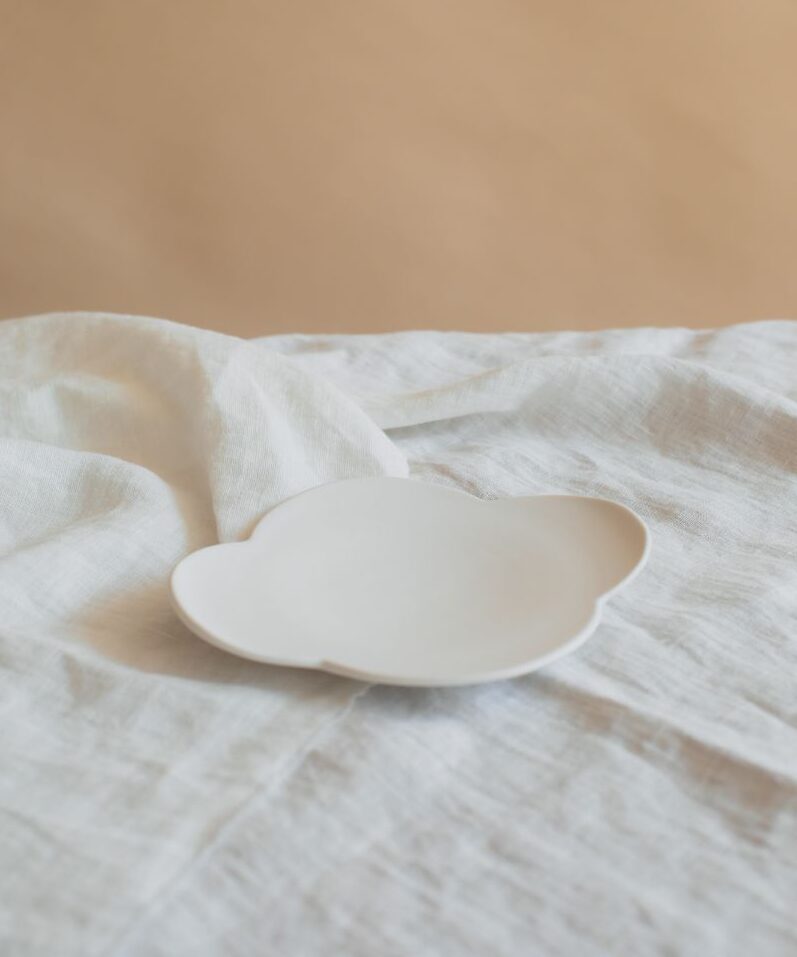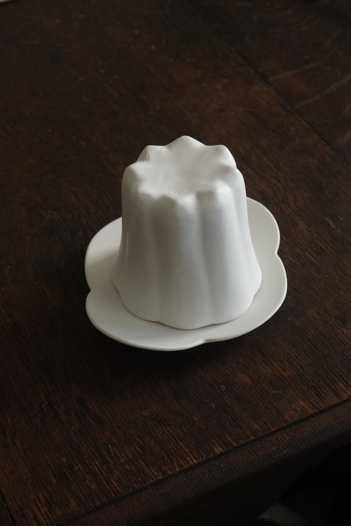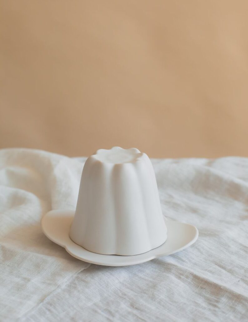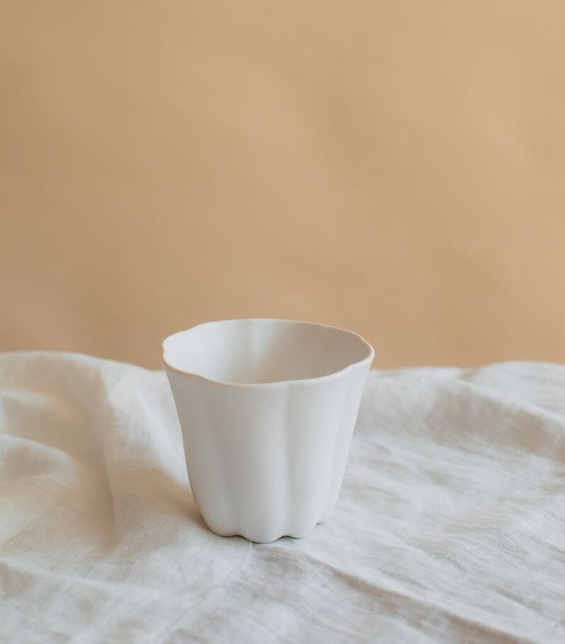 Matte white glaze is the main color of her arts, which brings a clear and refreshing vibe into your interior, the Canele shape cup and petal saucer plate would look nice both together.